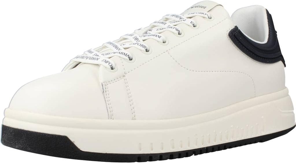 Emporio Armani White Sneakers with Navy Blue Rubbe. Ideal for Clothing, Shoes & Jewelry > Men > Shoes > Fashion Sneakers.
