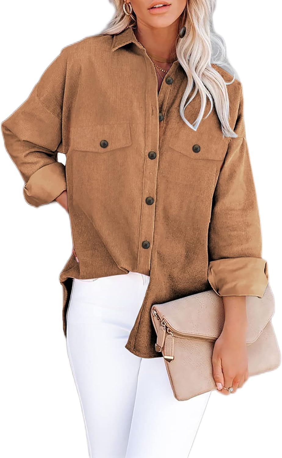 SHEWIN Womens Corduroy Long Sleeve Button Down Shi